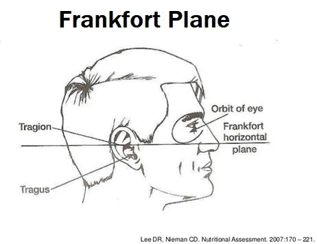 - La persona debe estar mirando al frente correctamente: ubicar la cabeza en plano de Frankfort como se muestra en la figura, trazando una línea horizontal imaginaria desde la nariz, la línea inferior de la órbita del ojo hasta el tragion o pabellón auricular.
