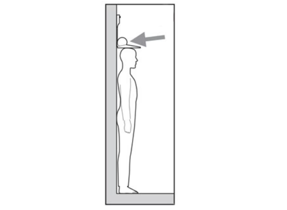 - La persona a medir se ubica justo debajo del tallímetro, descalzo, con hombros relajados, la escápula, glúteos y talones deben estar tocando la pared, brazos a cada lado del tronco, piernas rectas y juntas.